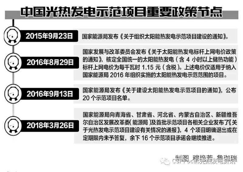 2016年9月,在國家能源局公布的首批光熱發(fā)電示范項目名單中,有20個項目在111個申請競爭中勝出,總裝機容量1.349吉瓦。據(jù)相關(guān)文件規(guī)定,在2018年底前并網(wǎng)的示范項目可以享受1.15元/千瓦時的上網(wǎng)電價。這些項目中,共有9個項目采用塔式發(fā)電技術(shù),7個采用槽式發(fā)電技術(shù),4個采用線性菲涅爾技術(shù),所有項目都設(shè)計了大容量、多時長的儲熱系統(tǒng)。