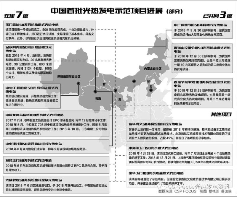 目前已并網(wǎng)的三座光熱發(fā)電示范項目分別為中廣核德令哈50兆瓦槽式光熱電站、首航節(jié)能敦煌100兆瓦熔鹽塔式光熱電站、青海中控德令哈50兆瓦熔鹽塔式光熱電站。