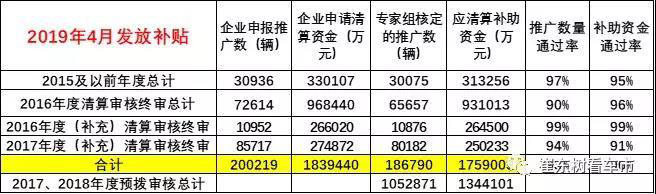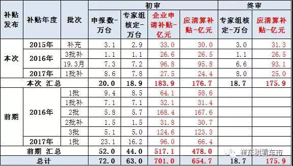 目前看,此次共發(fā)放2015年到2017年共4批新能源車補(bǔ)貼,企業(yè)申報數(shù)量共20萬臺,實際審核補(bǔ)貼18.6萬臺,通過率93%。企業(yè)申報資金183.9億元,審核清算資金達(dá)到175.9億元,通過率達(dá)到96%,總體表現(xiàn)較好。