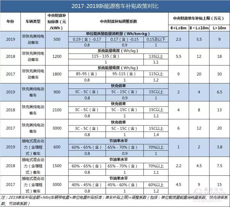 新能源客車方面,相比2018年,所有類型客車補貼標準均由千元/kwh跌至百元/kwh,其中快充類純電動客車退坡幅度最大,直接從2100/kwh將至900/kwh。此外,所有類型客車的單車補貼上限也都腰斬過半。