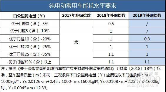 2018年,相關(guān)政策開始對純電動乘用車百公里耗電量(Y)表現(xiàn)較好的產(chǎn)品給予額外補貼。今年該補貼仍在,不過對能耗標準有了進一步的提升。