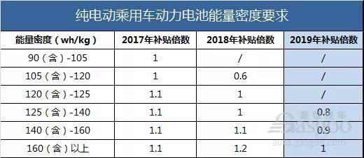 動力電池能量密度的補貼標準也是業(yè)界重點關(guān)注的對象之一,此次新政再次提高了純電動乘用車電池能量密度的補貼標準門檻,由2018年最低105Wh/kg調(diào)整為最低125Wh/kg,而最高補貼倍數(shù)則由2018年的 1.2倍降至1倍。