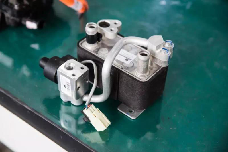 在冷卻方式上,比亞迪在電池內(nèi)增加了散熱回路,通過(guò)板式換熱器與空調(diào)回路相連,電池進(jìn)出水和電池級(jí)耳處都布有溫度傳感器,結(jié)合電池溫度實(shí)時(shí)調(diào)節(jié)空調(diào)壓縮機(jī)的功率來(lái)控制電池進(jìn)水溫度及流量,以此來(lái)控制電池溫度在適宜工作溫度。