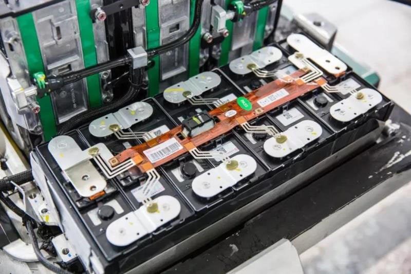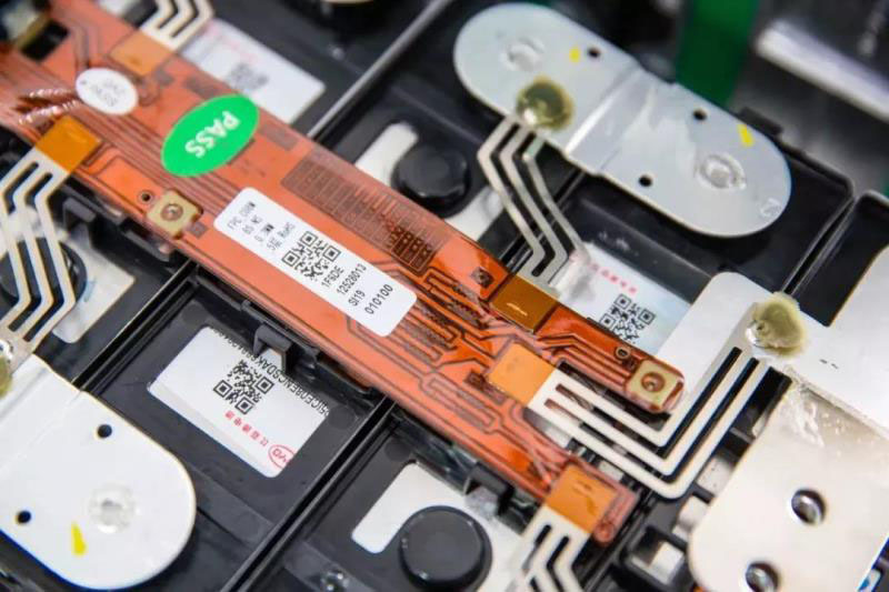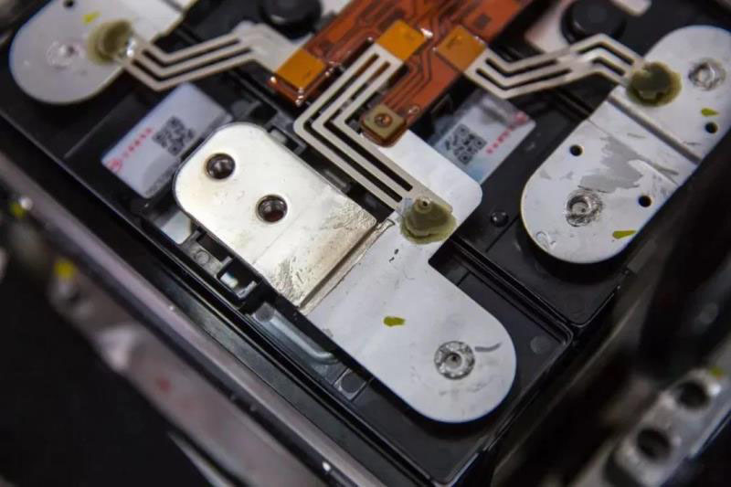 在信號(hào)連接的部分,比亞迪采用了柔性電路板,相對(duì)于傳統(tǒng)采樣線束的方案,集成度更高,也更輕薄。如果仔細(xì)觀察,會(huì)發(fā)現(xiàn)柔性電路板上有細(xì)絲狀的布線,我們稱(chēng)之為采樣線熔斷線。它的作用是在碰撞時(shí),可能會(huì)擠壓采樣線束造成短路,進(jìn)而引起采樣線起火,這些細(xì)絲便會(huì)在短路時(shí)由于過(guò)流而發(fā)生熔斷,從而切斷短路回路,確保整個(gè)線束的安全和電池模塊的安全。