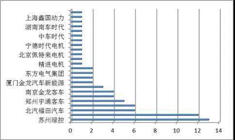 在這其中,蘇州綠控為13款車型配套電機,數(shù)量最多;其次是湖南中車時代,為12款車型配套電機。另外,北汽福田汽車、廈門金龍旅行均為5款車型配套,位列第三。