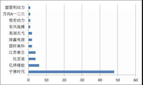 共11家企業(yè)為本批推薦目錄新能源客車提供電池配套。第一名為寧德時代,為48款車型配套電池,占比66.67%;第二名是億緯鋰能,為6款車型配套;第三名是江蘇春蘭,為4款車型配套。