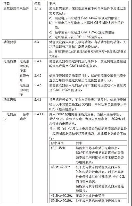 作為產(chǎn)品定型標(biāo)準(zhǔn),該標(biāo)準(zhǔn)涵蓋了儲(chǔ)能變流器的安全要求、性能和功能要求(包括并網(wǎng)兼容性要求)、環(huán)境適應(yīng)性要求、電磁兼容性要求等諸多方面的技術(shù)要求。下面僅對并網(wǎng)模式以及并離網(wǎng)運(yùn)行模式下的儲(chǔ)能變流器涉網(wǎng)部分的要求進(jìn)行分析。