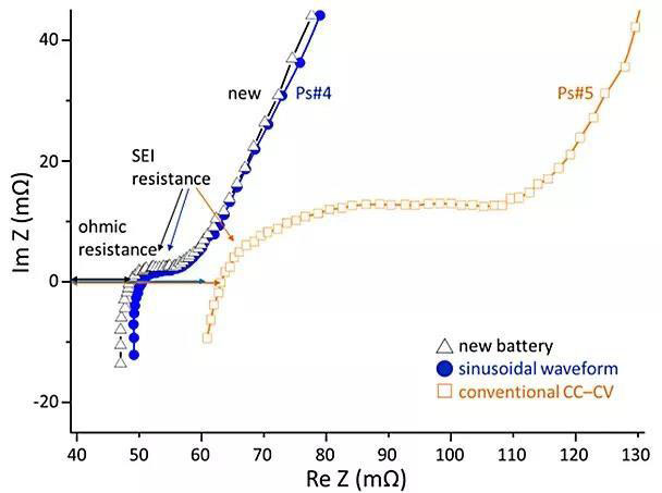 為驗證弦波充電法對于電池內(nèi)部SEI膜阻抗的影響情形,研究人員利用電化學(xué)阻抗圖譜(EIS)對電池進行分析,結(jié)果顯示使用此充電法進行600次循環(huán)后的電池比起使用傳統(tǒng)CC-CV的電池,有效抑制了SEI膜的成長,并能保持與全新電池內(nèi)部阻抗相近的水平,說明此充電法對于鋰離子電池內(nèi)部材料結(jié)構(gòu)的破壞情形較小,而能提供電池更長的使用壽命,故此充電法將提供鋰離子電池產(chǎn)品使用者更好的選擇。