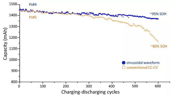 研究人員以電動車用電池容量低于80%就需汰換的標(biāo)準(zhǔn),來比較弦波充電法與傳統(tǒng)CC-CV充電法的電池電容量,并對電池以大電流充放電的方式來模擬電動車使用情境,由實驗結(jié)果可發(fā)現(xiàn)傳統(tǒng)CC-CV充電法于600次循環(huán)后就達80%容量,而使用弦波充電法的電池還有剩余95%的電容量,說明弦波充電法對于電池使用壽命上有延長的功效。