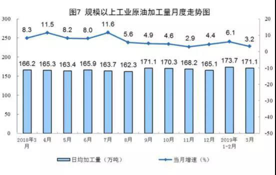 3月份,原油加工量同比增長3.2%,增速比1—2月份回落2.9個百分點(diǎn);日均加工171.1萬噸,比1—2月份日均減少2.6萬噸。1季度,原油加工量15537萬噸,同比增長4.4%,比去年同期回落3.1個百分點(diǎn)。