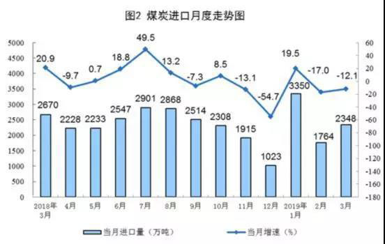 3月份進(jìn)口煤炭2348萬噸,同比下降12.1%,連續(xù)兩個月降幅達(dá)兩位數(shù)。1季度煤炭進(jìn)口量同比下降1.8%。