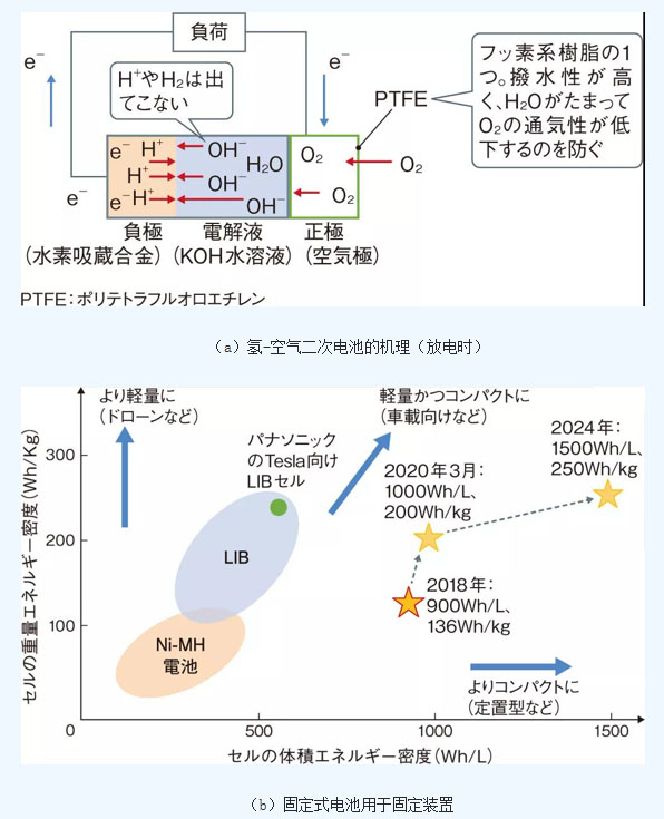 由同志社大學(xué)盛滿實(shí)驗(yàn)室與FDK共同開發(fā)的氫/空氣可充電電池概要(a)。使用空氣電極作為正極,氫氧化鉀(KOH)水溶液作為電解液,儲(chǔ)氫合金作為負(fù)極。與燃料電池不同,它不使用氫分子(H2)也不進(jìn)行氫氣填充。由于水溶液是堿性的,因此H+不會(huì)從負(fù)極中出來(lái)。在充電時(shí),它通過(guò)類似于堿性水電解的原理從負(fù)極界面處的水中吸收H+。由于在放電時(shí)產(chǎn)生的是H2O,因此與金屬-空氣電池不同,“正電極上不會(huì)積聚灰導(dǎo)致窒息”。2Ah的試制電池非常薄,與具有相同容量的LIB電池相比更加緊湊(b)。今后的開發(fā)將基于提高體積能量密度為核心,預(yù)計(jì)其主要應(yīng)用于固定型蓄電池應(yīng)用(c)。