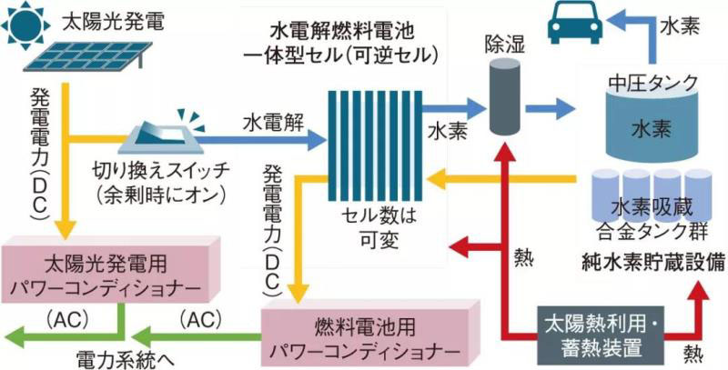 在福島可再生能源研究中心運(yùn)行的水電解燃料電池集成型電池及其外圍系統(tǒng)(a)。當(dāng)太陽(yáng)能發(fā)電對(duì)于電力系統(tǒng)出現(xiàn)過(guò)剩時(shí),從電網(wǎng)互連切換到水電解產(chǎn)生氫氣并將其存儲(chǔ)在罐中。另一方面,當(dāng)電力系統(tǒng)的電力趨于不足時(shí),儲(chǔ)存的氫氣用于燃料電池中以發(fā)電并連接到系統(tǒng)。此外還獨(dú)立進(jìn)行了儲(chǔ)氫合金的研究(b)。使用時(shí)的問(wèn)題之一是切換水電解和燃料電池模式需要花費(fèi)大約10~30分鐘,時(shí)間較長(zhǎng)。