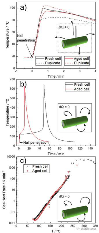 圖6.滿充電池在開放條件下(a)和絕熱條件下(b)針刺結(jié)果對比。(c)為ARC測試結(jié)果。