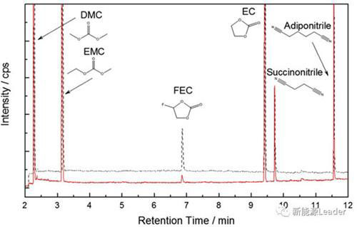 作者還進(jìn)一步對新鮮電池和析鋰?yán)匣箅姵仉娊庖撼煞诌M(jìn)行了分析。GC-MS結(jié)果顯示三星SDI該款電池電解液溶劑組分主要為EC、EMC和DEC,電解液添加劑包含F(xiàn)EC、succinonitrile(丁二腈)和adiponitrile(己二腈)。其中EMC的作用主要是提升電池在低溫下的電化學(xué)性能,F(xiàn)EC作為成膜添加劑之一同樣能提高電池的低溫表現(xiàn),而丁二腈和己二腈則可以降低電解液在高溫和高電壓下的氧化反應(yīng)。GC-MS結(jié)果析鋰?yán)匣蟮碾姵仉娊庖航M分中FEC含量較新鮮電池有顯著降低,原因在于FEC同析出的金屬鋰作用在其表面形成SEI膜。