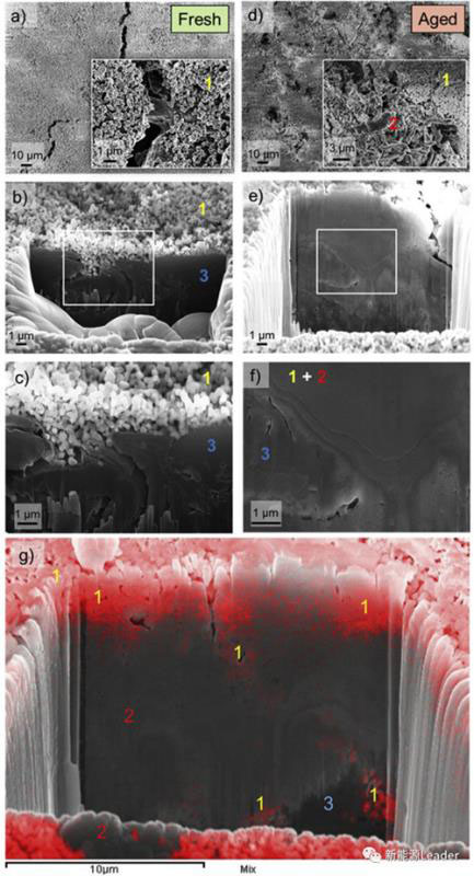 圖4.(a-c)新鮮電池負(fù)極SEM圖像;(d-f)電池0 ℃循環(huán)老化EOL狀態(tài)負(fù)極SEM圖像;(g)電池0 ℃循環(huán)老化EOL狀態(tài)負(fù)極剖面SEM圖像,其中紅色所示為EDX得到的Al2O3分布。圖中數(shù)字1、2、3分別代表Al2O3分布涂層、析出的金屬鋰和涂覆層下的石墨。