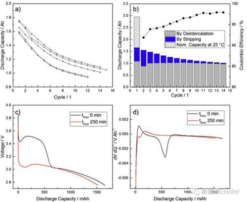 圖3.電池在0 ℃、1 C條件下循環(huán):(a)放電容量隨循環(huán)圈數(shù)關(guān)系;(b)放電容量中鋰離子脫出和金屬鋰剝離占比;(c)電池0 ℃、1 C滿充后靜置不同時(shí)間放電曲線對比;(d)由圖C轉(zhuǎn)換得到的dV/dQ曲線。