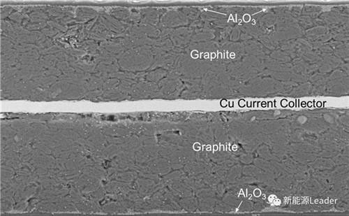 如圖1所示,由于表面涂覆Al2O3的原因,三星該款電池拆解后負(fù)極極片表面呈銀灰色,與普通的石墨負(fù)極極片顏色有所不同。負(fù)極極片總厚度165-170 μm,雙面涂覆Al2O3,且部分銅箔區(qū)域也涂覆了2-10 μm厚度的Al2O3。從圖2 SEM圖像可以看到極片表面的Al2O3涂覆厚度很薄,雖然圖中未給出具體標(biāo)尺,但根據(jù)圖1中所標(biāo)注的尺寸及后文的介紹可了解到該Al2O3涂覆層厚度為1-5 μm。稍顯遺憾的是電池拆解后作者之關(guān)注了負(fù)極的涂覆情況,對正極和隔膜表面是否有Al2O3涂覆未作介紹。