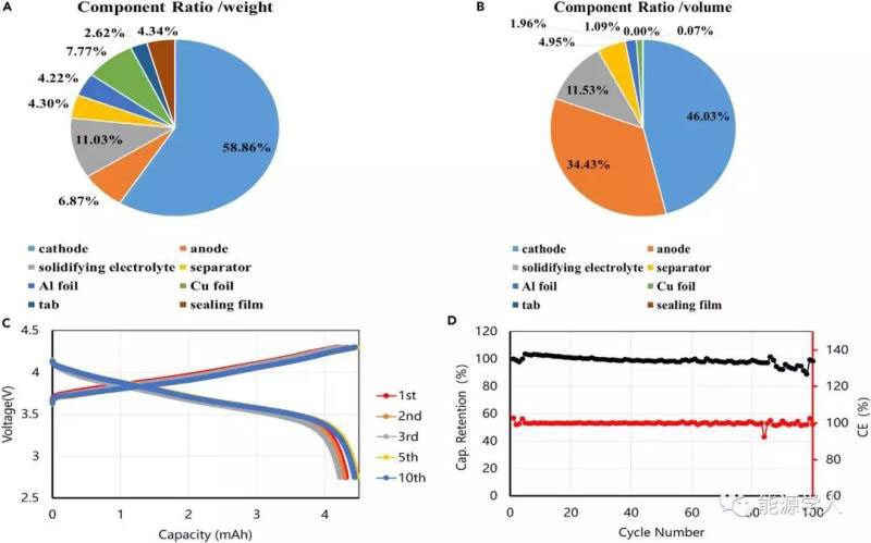 圖1. 真實Li/NCA軟包電池中各組分的重量、體積比及其電化學性能;(A)重量比,(B)體積比,(C) 2.75–4.3V電壓下0.3C時的電池充放電曲線,(D)電池的容量保留率和庫倫效率。