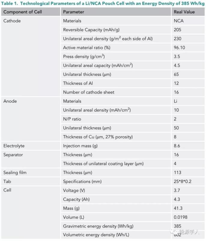 表1. 能量密度為385Wh/kg時,Li/NCA軟包電池的工藝參數(shù)。