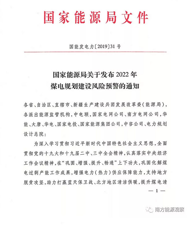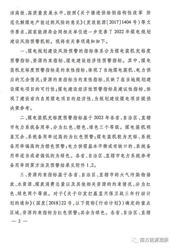 國家能源局關于發(fā)布2022年煤電規(guī)劃建設風險預警的通知