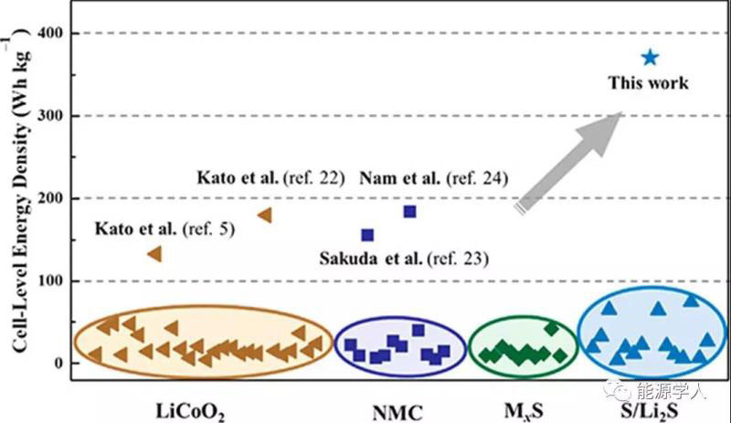 Figure 7. 使用硫化物電解質(zhì)的全固態(tài)電池的電池水平能量密度。不同正極的電池用不同的顏色表示。電流集流體的重量不包括在計算中,并且該工作的電池水平能量密度是基于第一次循環(huán)的可逆容量計算的。