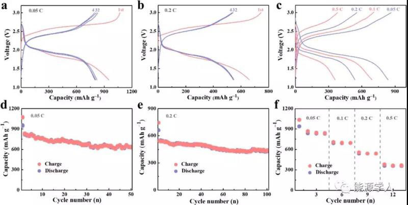 Figure 5.(a-c)在25℃的溫度下,正極支撐的全固態(tài)Li-Li2S電池在(a)0.05C,(b)0.2C和(c)0.05至0.5C的不同倍率下的充放電曲線;(d, e)在25℃的溫度下,正極支撐的全固態(tài)Li-Li2S電池在(d)0.05和(e)0.2C倍率下的循環(huán)性能;(f)在25℃的溫度下,正極支撐的全固態(tài)Li-Li2S電池的倍率性能。比容量是基于正極復(fù)合材料中Li2S 的質(zhì)量計算,Li2S負載量為2.54mg/cm2。