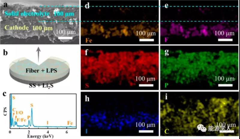 使用孔徑為約200μm的SS網(wǎng)(圖3a,b)作為集流體以增強Li2S正極的機械強度和完整性。集流體獨特網(wǎng)狀結(jié)構(gòu)允許高負載活性材料(Li2S:2.54-7.64mg/cm2)。Kevlar非織造支架的網(wǎng)狀結(jié)構(gòu)如圖3e,f所示,將LPS懸浮液滴入Kevlar非織造支架中,其滴入量控制固體電解質(zhì)的厚度。EDS映射中的元素分布圖4 d-i顯示,所述正極層和電解質(zhì)層的厚度都是100μm左右,F(xiàn)e,F(xiàn)和I僅在正極存在,而P,S是存在于正極和電解質(zhì)中。