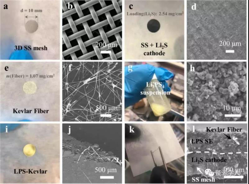 Figure 3. (a, b)SS網(wǎng)的光學(xué)照片和SEM圖像;(c, d)SS-Li2S復(fù)合正極的光學(xué)照片和SEM圖像;(e, f)Kevlar非織造支架的光學(xué)照片和SEM圖像;(g)Li3PS4電解質(zhì)懸浮液;(h)Li3PS4從懸浮液中干燥之后SEM圖像;(i, j)Li3PS4-Kevlar電解質(zhì)的光學(xué)照片和SEM圖像;(k, l)SS網(wǎng)負載正極和Li3PS4-Kevlar電解質(zhì)的光學(xué)照片和SEM圖像。
