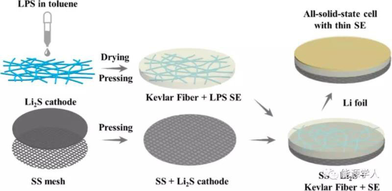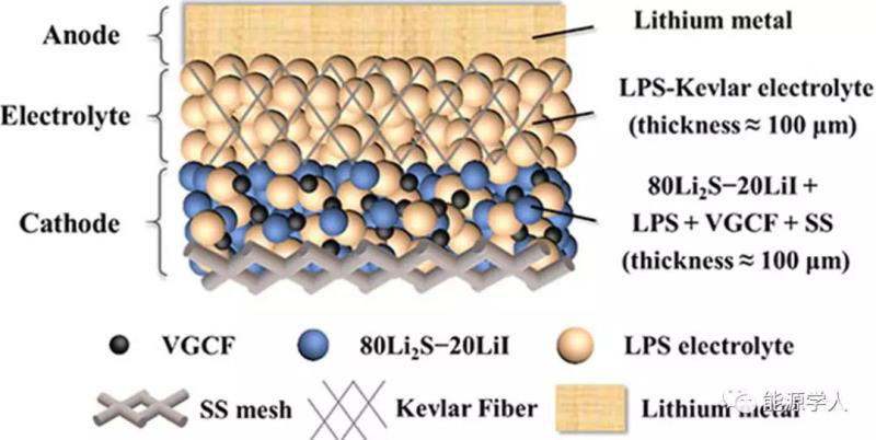 將活性材料與氣相生長碳纖維(VGCF)和LPS電解質(zhì)按重量比為75:10:15混合以制備正極。Li2S在正極復(fù)合材料中的含量為43.4wt%,這是所有報道的基于Li2S正極的全固態(tài)電池中的最高值。首先,將得到的正極粉末與聚四氟乙烯(PTFE)粘合劑混合,在研缽中研磨,然后卷成薄片,將制備好的正極薄膜冷壓到SS網(wǎng)狀集電器上。其次,通過將甲苯中LPS懸浮液滴加到Kevlar非織造支架中,隨后在真空下干燥過夜來制備薄電解質(zhì)層。最后,將LPS-Kevlar電解質(zhì)冷壓在正極膜上,將薄的Li金屬附著到固體電解質(zhì)的頂側(cè)以形成全固態(tài)全電池。值得注意的是,本文中LPS與Li不是熱力學(xué)穩(wěn)定的,而是通過形成鈍化界面來實現(xiàn)界面穩(wěn)定性。這種全固態(tài)電池的示意圖如圖2所示。