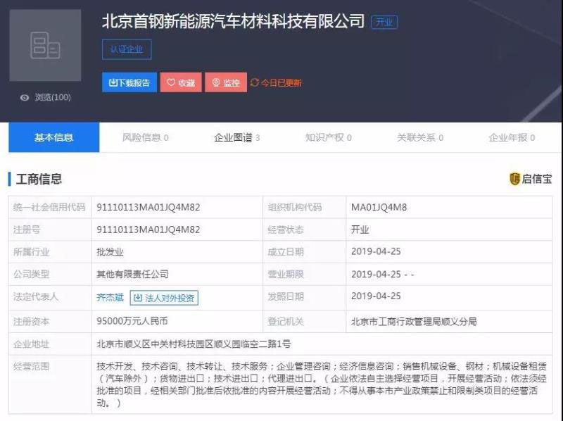 新能源汽車產(chǎn)業(yè)再迎強(qiáng)勁玩家,4月25日,北京首鋼新能源汽車材料科技有限公司正式成立,法定代表人為齊杰斌,注冊資本9.5億元人民幣。