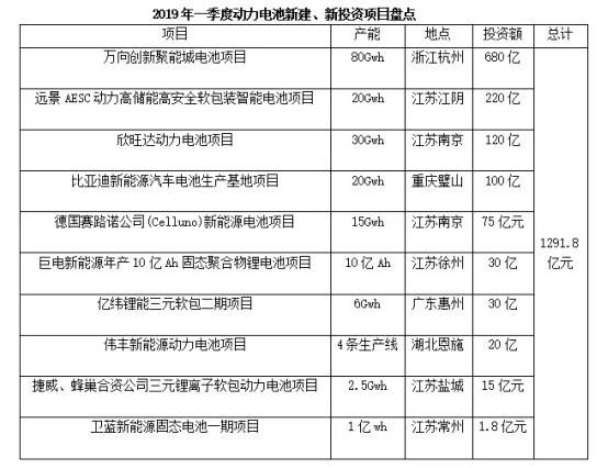 據(jù)不完全統(tǒng)計,2019年一季度動力電池新建、投資項目達10個,總產(chǎn)能超170Gwh,總投資額達1291.8億元。