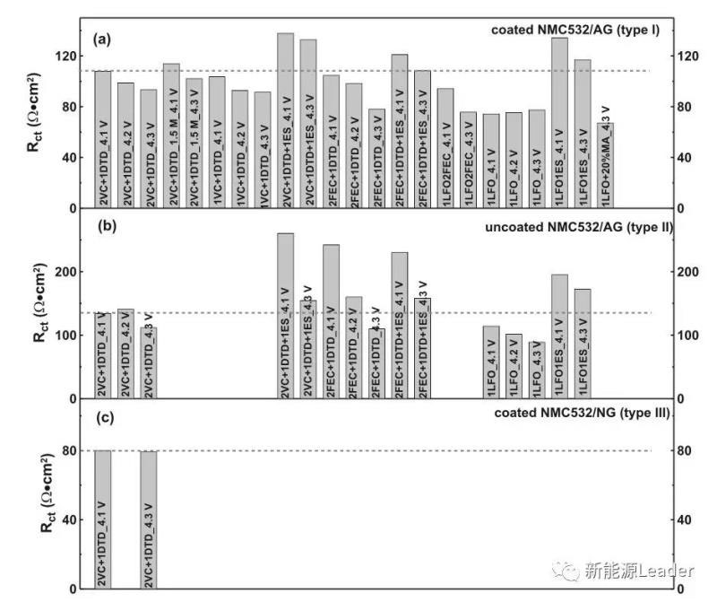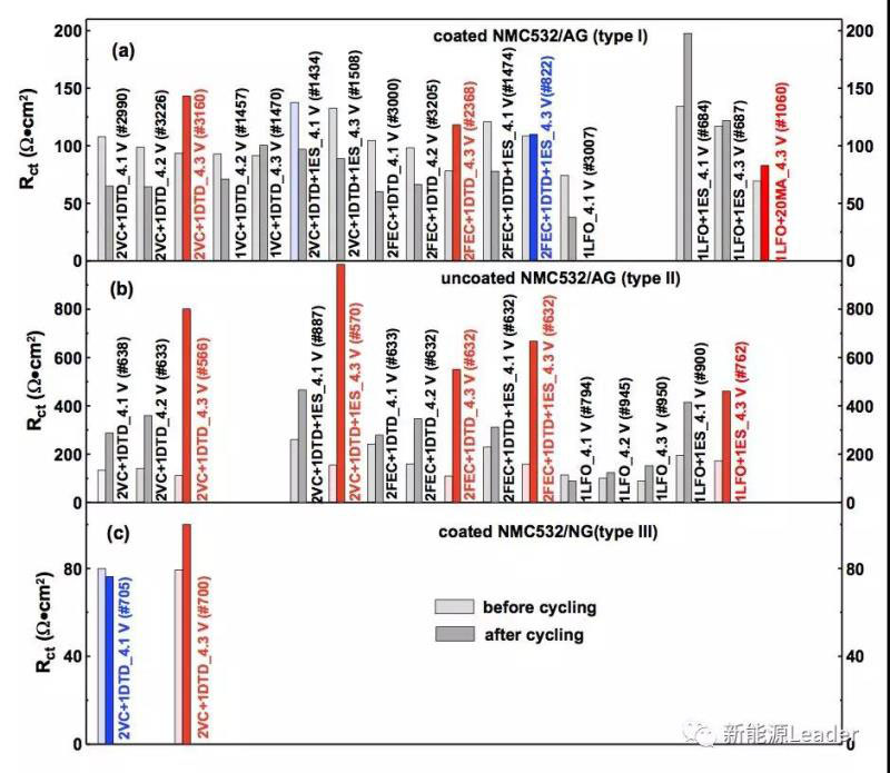 下圖為幾種電池化成后的Rct(電荷交換阻抗)的數(shù)值(電池分別采用4.1V、4.2V和4.3V三種截止電壓),從下圖a(涂層單晶NCM523(21.1mg/cm2)/人造石墨(12.4mg/cm2))能夠看到多數(shù)電池隨著充電截止電壓的提高,Rct都會變的更低,只有電解液中僅含有LFO的電池不同截止電壓下電池的Rct都很低。同時我們對比下圖a和c還能夠發(fā)現(xiàn)采用天然石墨的電池的Rct要比采用人造石墨的電池更低,同時加入ES添加劑也會導致更高的Rct。
