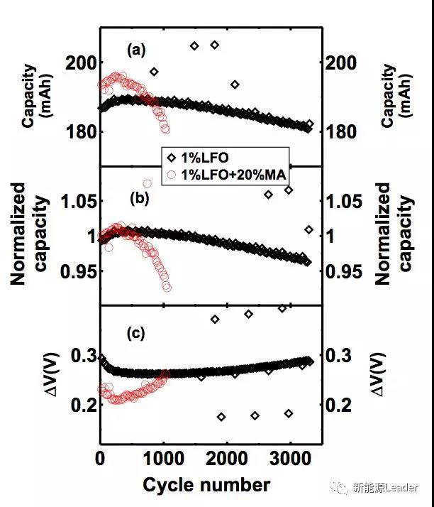 作者的工作表明涂層NCM523/人造石墨電池,采用2%FEC+1%LFO電解液的電池在1C倍率,3.0-4.3V電壓范圍內(nèi)可以循環(huán)超過4000次,如果將充電截止電壓降低達到4.1V或4.2V還能夠增加幾千次的循環(huán)壽命,具有廣泛的應用前景。