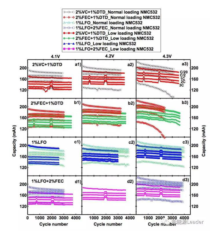 在上述電池循環(huán)過程中,作者每循環(huán)100次就對電池在C/20、C/2、1C、2C和3C倍率下的放電能力進行了測試(結(jié)果如下圖所示,每張圖片自上而下分別為C/20、C/2、1C、2C、3C的容量變化),從圖中能夠看到非涂層NCM523/石墨電池在4.3V下循環(huán)時3C放電容量衰降的非???,這其中采用2%FEC+1%DTD電解液的電池的3C放電容量的衰降速度要明顯快于2%VC+1%DTD的電池,而采用1%LFO電解液的電池的3C放電能力在經(jīng)過4000次循環(huán)后仍然沒有非常顯著的衰降,這也表明了電解液添加劑的重要性。
