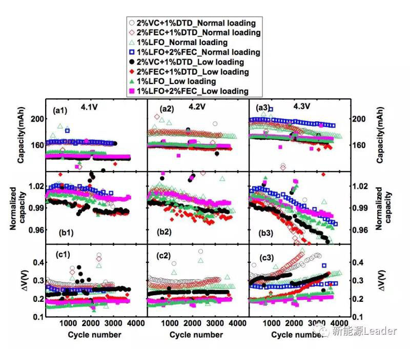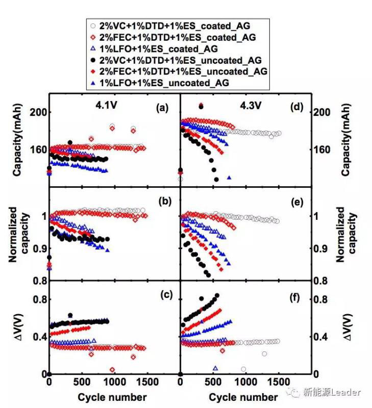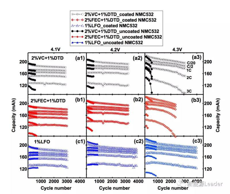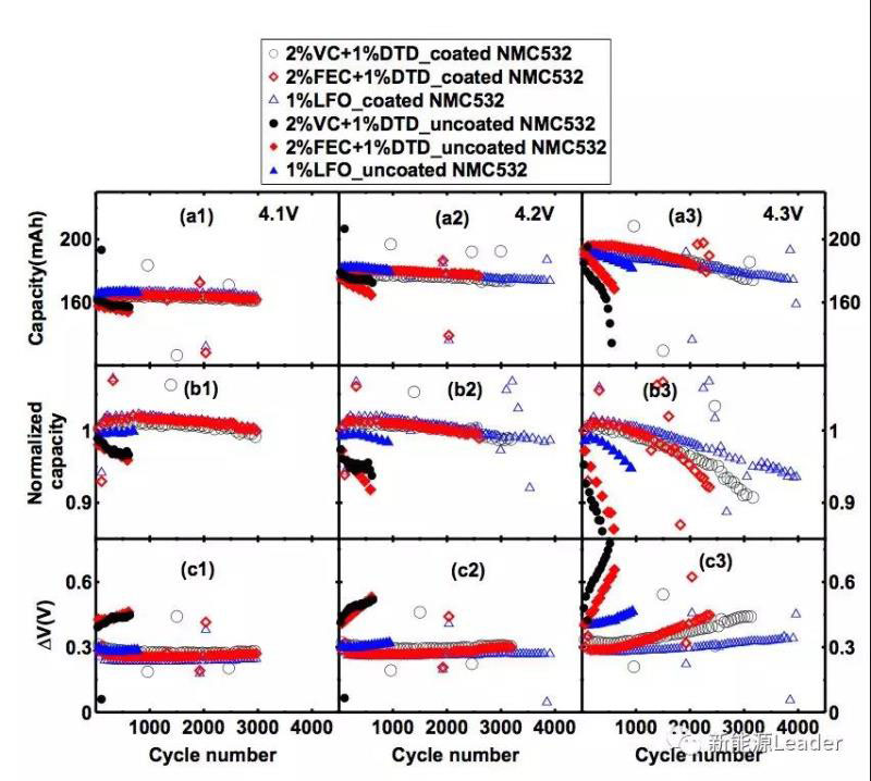 采用2%FEC+1%DTD的涂層NCM523電池在4.3V循環(huán)2000次后出現(xiàn)了容量跳水的現(xiàn)象,采用1%LFO電解液的非涂層NCM523電池在循環(huán)700次后出現(xiàn)容量跳水的現(xiàn)象,而采用2%VC+1%DTD電解液的涂層NCM523電池在4.3V循環(huán)2500次后出現(xiàn)容量跳水,采用1%LFO電解液的涂層NCM523電池在循環(huán)超過4000次后仍然沒有出現(xiàn)容量跳水的現(xiàn)象。