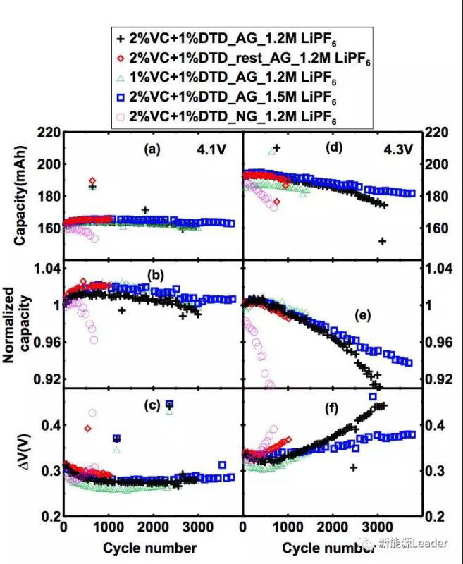 下圖為采用人造石墨和天然石墨的電池使用不同電解液時的循環(huán)性能,從下圖能夠發(fā)現(xiàn)涂層NCM523/天然石墨的電池采用2%VC+1%DTD會導致電池的循環(huán)壽命急劇衰降,而如果僅將負極更換為人造石墨循環(huán)性能就會大幅改善。同時從下圖我們還能夠注意到去掉靜置時間、提高LiPF6濃度,以及添加2%VC+1%DTD都能夠有效的提高涂層NCM523/人造石墨在4.3V下的循環(huán)性能。