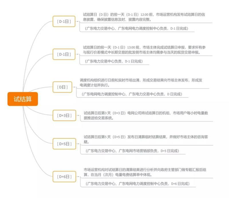 市場運營機構(gòu)對試結(jié)算日的清算結(jié)果進(jìn)行分析并向政府主管部門做專題匯報后結(jié)算,在當(dāng)月(次月)電量電費結(jié)算單中體現(xiàn)。(廣東電力交易中心、廣東電網(wǎng)電力調(diào)度控制中心負(fù)責(zé),D+6 日完成)