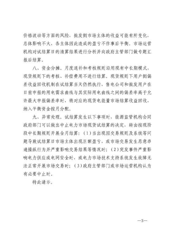 出清的方式是:按照日前和實時出清結(jié)果,形成試結(jié)算日的發(fā)電調(diào)度計劃并執(zhí)行。《請示》提到在交易結(jié)算方面。將試結(jié)算日的出清結(jié)果按現(xiàn)貨順價模式結(jié)算,當(dāng)月其余天仍按照現(xiàn)有價差模式結(jié)算。
