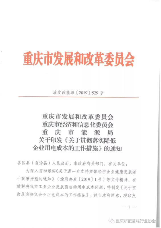2019年4月28日,重慶市發(fā)改委、經(jīng)信委、能源局聯(lián)合印發(fā)了《關(guān)于貫徹落實降低企業(yè)用電成本的工作措施》(渝發(fā)改能源 [2019]529號,以下簡稱工作措施)的通知。該文件是落實重慶市政府一號文《關(guān)于進(jìn)一步支持實體經(jīng)濟企業(yè)健康發(fā)展若干政策措施》(渝府辦[2019]1號)的配套舉措。根據(jù)渝府辦[2019]1號的要求,從發(fā)電、輸配、政府基金及附加、用戶四端共同發(fā)力,將產(chǎn)品有市場的重點工業(yè)企業(yè)用電價格降低到0.6元/千瓦時左右?!豆ぷ鞔胧吩诖吮尘跋鲁雠_,強調(diào)了通過市場機制降低工商企業(yè)用電成本。注意到,文中強調(diào)的“成本”包含但并不局限于用電“價格”,而是從資產(chǎn)管理、優(yōu)化運營、用戶服務(wù)等多維度為企業(yè)減負(fù),提升企業(yè)獲得感。