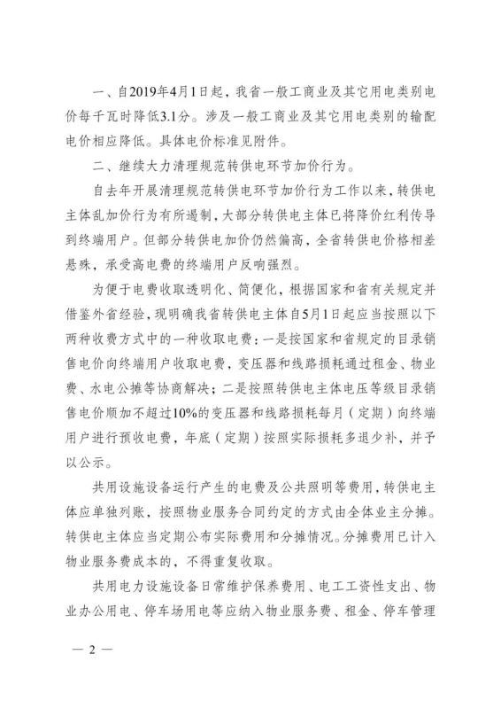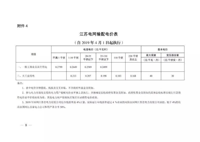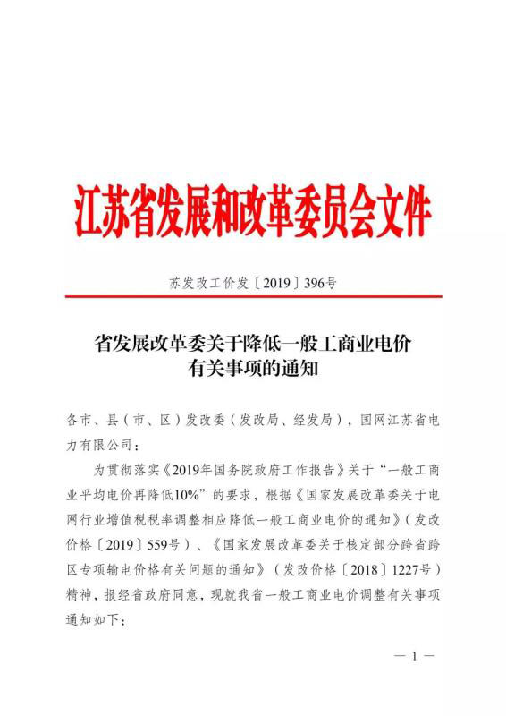 4月29日,江蘇發(fā)改委正式印發(fā)《省發(fā)展改革委關于降低一般工商業(yè)電價有關事項的通知》。自2019年4月1日起,江蘇省一般工商業(yè)及其它用電類別電價每千瓦時降低3.1分。涉及一般工商業(yè)及其它用電類別的輸配電價相應降低。