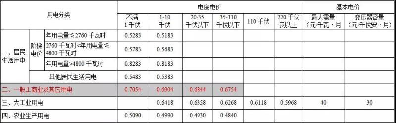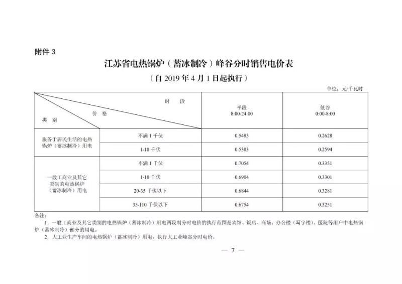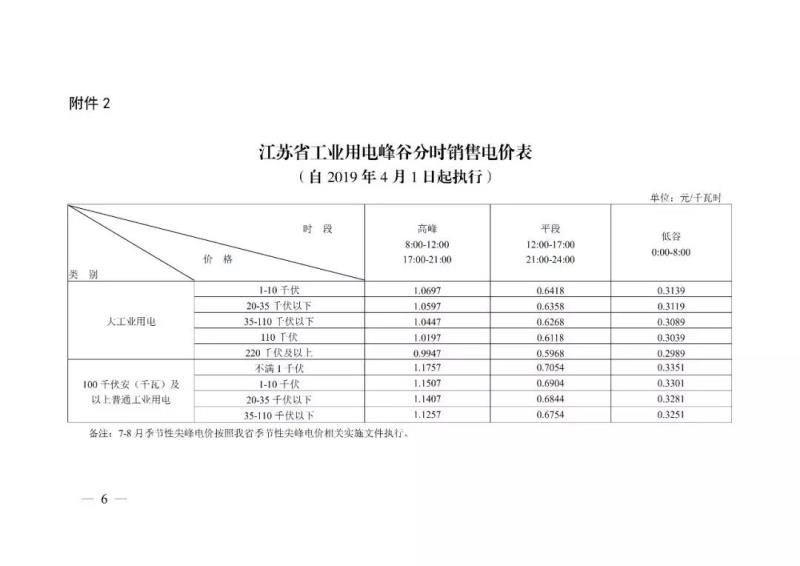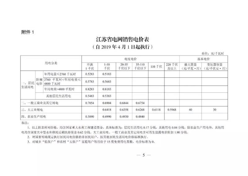 2019年4月1日起執(zhí)行的江蘇省電網銷售電價表。單位:元/KWh。