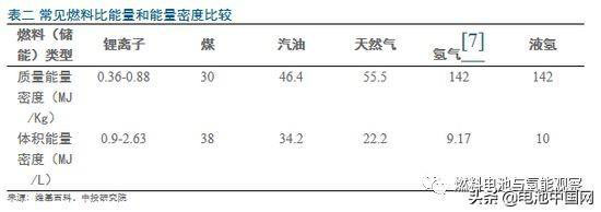 同其他燃料相比,氫的最大優(yōu)勢是超高的質(zhì)量能量密度和可接受的體積能量密度(需壓縮氫氣或液化),常見燃料能量密度如表二所示: