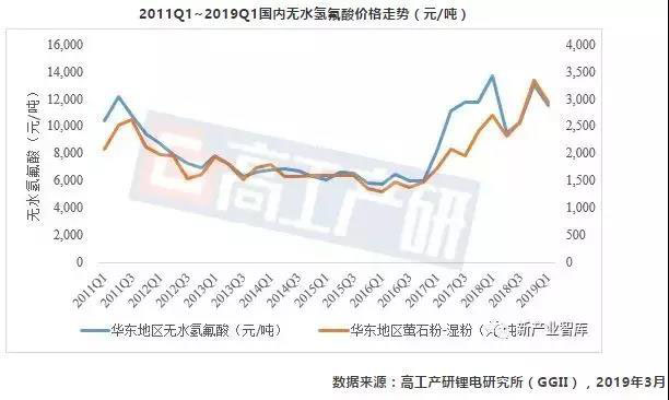 成本方面,2019年無水氟化氫占六氟磷酸鋰總成本34.61%,是后者主要成本影響因素之一。近兩年氫氟酸價格大幅拉漲,國內(nèi)氫氟酸生產(chǎn)裝置整體開工率僅有六七成,貨源十分緊張。截至2019Q1市場報價11553萬元/噸(詳見下圖)。一般而言,氫氟酸每噸上漲3000元/噸,對六氟磷酸鋰的成本影響在1萬元/噸左右。