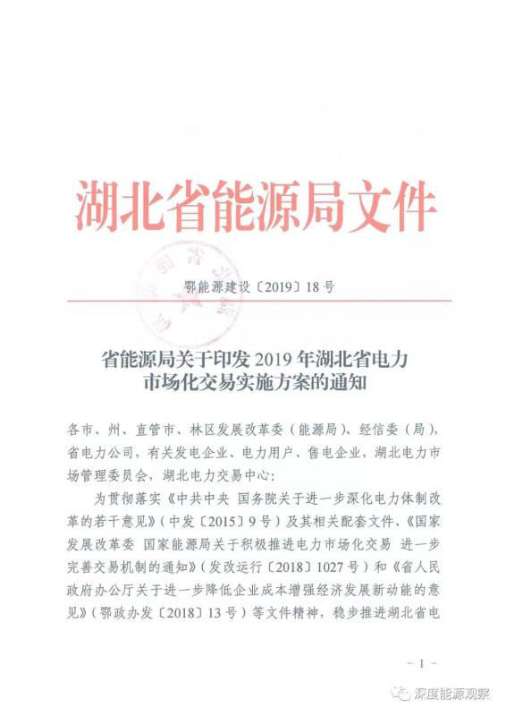 2019年5月5日,深度能源觀察獲悉,湖北省能源局發(fā)布《2019年湖北省電力市場化交易實施方案》,《實施方案》提出: