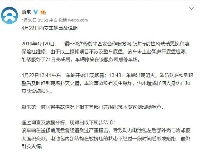 此前,針對(duì)4月22日西安發(fā)生的蔚來汽車ES8自燃事件,蔚來汽車給出了調(diào)查結(jié)論:該車輛在送修前底盤曾經(jīng)遭受過嚴(yán)重撞擊,導(dǎo)致動(dòng)力電池包左后部外殼與冷卻板大面積變形。電池包內(nèi)部結(jié)構(gòu)在被擠壓的狀態(tài)下經(jīng)過一段時(shí)間后形成短路,最終引發(fā)火情。