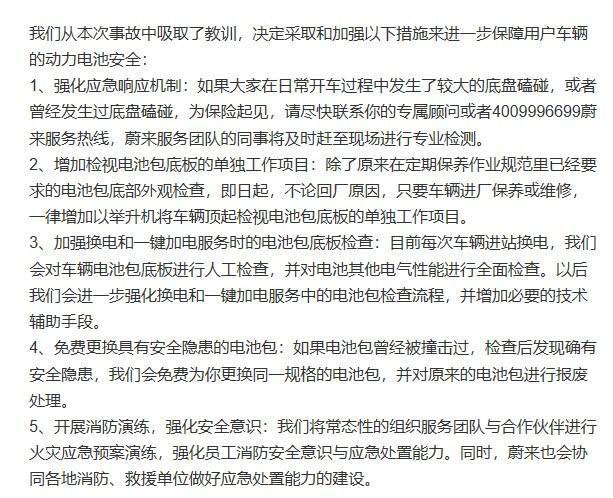 為進(jìn)一步保障用戶車輛的動(dòng)力電池安全,近日,蔚來汽車官方發(fā)布了“進(jìn)一步保障動(dòng)力電池安全的行動(dòng)方案”,其中包括了五大措施: