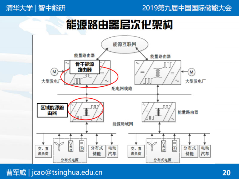曹軍威:非常高興有機(jī)會(huì)在這里和大家分享。能源路由器的概念是從能源互聯(lián)網(wǎng)的概念延伸出來的。我們前幾年做了類似的裝置和示范工程,跟大家簡單匯報(bào)一下。背景不再多說了,上午專家已經(jīng)說了。能源互聯(lián)網(wǎng)希望像互聯(lián)網(wǎng)一樣自下而上:下有綜合性的園區(qū),上有國家電網(wǎng)的全球能源互聯(lián)網(wǎng),自下而上構(gòu)建能源基礎(chǔ)設(shè)施。從互聯(lián)網(wǎng)的概念類比過來,是不是有可能有類似這種局部的能量層面上的交換和路由裝置。這就是路由器和互聯(lián)網(wǎng)的基本提法?,F(xiàn)在已經(jīng)成為趨勢,之前做學(xué)術(shù)研究的時(shí)候,2011年能源互聯(lián)網(wǎng)可能只是一個(gè)概念,現(xiàn)在大家把能源互聯(lián)網(wǎng)具體形式如綜合能源服務(wù)作為一個(gè)主流趨勢,包括儲(chǔ)能這樣一些具體的環(huán)節(jié),也在大發(fā)展過程中。不詳細(xì)講了。