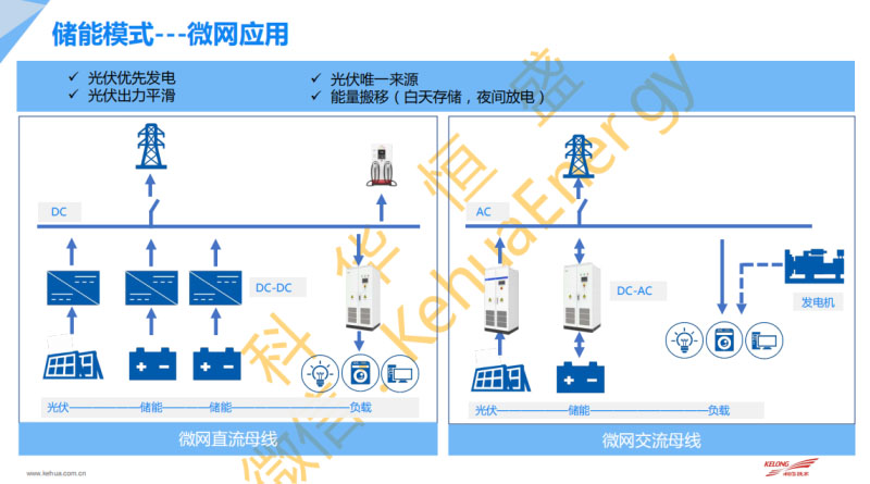 這是我們在離網(wǎng)這一塊的內(nèi)容。另外談到微網(wǎng)應(yīng)用,其實在微網(wǎng)應(yīng)用有兩種模式,一種是DC方案,一種是AC方案。各有優(yōu)勢和劣勢。比如說交流方案,從直流方案來看,它的好處是直流相比來說接入點不一樣。它接入的直流是有一個電壓,正負(fù)極的區(qū)別。但是交流不一樣。從整個的結(jié)構(gòu)來看,直流又存在另外一個問題。因為直流的保護(hù),本身技術(shù)沒有零點,保護(hù)措施是有差異的。第二個問題在于大、微電網(wǎng)。微電網(wǎng)和大電網(wǎng)的區(qū)別就是小跟大的區(qū)別。小的情況下,可以看一下這邊做的微電網(wǎng),核心點全部是電力電子器件,沒有所謂的發(fā)電機(jī)。這種情況下我們都知道,電力電子產(chǎn)品的特性完全不一樣。做電力穩(wěn)定的時候,考慮的不光是靠EMS可以搞定的,是靠器件的本身。直流有一個好處,其實像電池是不需要轉(zhuǎn)換的。這個時候你的尺寸就會做得很大。但是還有缺陷。缺陷在于我們直流這一塊的保護(hù)傳輸。相比交流的傳輸是有一定瓶頸的。