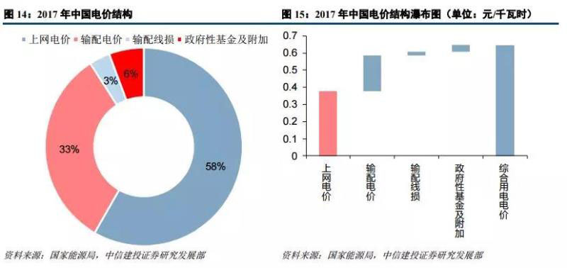 根據(jù)發(fā)改委 2017 年電力 價格監(jiān)管相關(guān)通告數(shù)據(jù),電網(wǎng)企業(yè)平均含稅銷售電價為 0.6091 元/千瓦時(不含政府性基金及附加)。對于下游 用戶綜合用電電價而言,其由發(fā)電企業(yè)上網(wǎng)電價(0.3763 元/千瓦時)、輸配電價(0.2107 元/千瓦時)、輸配電線 損(0.02213 元/千瓦時)和政府性基金及附加(0.0366 元/千瓦時),合計為 0.6457 元/千瓦時。從占比來看,上 網(wǎng)電價、輸配電價、輸配線損和政府性基金及附加占比分別為 58%、33%、3%和 6%。